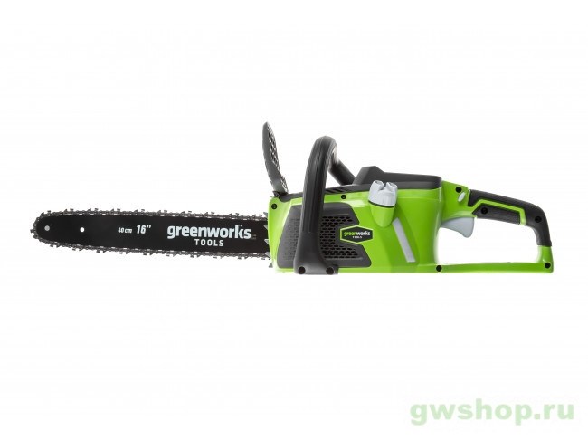 Пила цепная аккумуляторная G-MAX 40V GREENWORKS GD40CS40K4 аккумуляторная бесщеточная цепная пила c пильной шиной 40 см, с аккумулятором 4 Ah и зарядным устройством. Это полупрофессиональная цепная пила, которая отлично подойдет для полноценного ведения дачного хозяйства. Ее надежный бесщеточный двигатель серии DigiPro сопоставим по мощности с бензиновыми аналогами на 1,2-1,5 л/сил. При этом электродвигатель пилы Гринворкс абсолютно экологичен, имеет высокий крутящий момент (пилит быстрее бензинового аналога), имеет низкий уровень шума и вибраций, а так же прост в эксплуатации. Электро двигатель не требует подготовки масло-бензиновой смеси и какого-либо обслуживания. Включение пилы производится одной кнопкой. Замена и установка цепи не требует инструмента. Данная модель обладает компактными размерами, небольшим весом и долгим автономным временем работы (до 110 спилов от 4 А/час батареи), что делает ее незаменимым помощником на даче и в лесу. Пила оснащена шиной (40 см) из кремнистой стали и цепью производства компании Oregon. Масляный бачок для смазки цепи имеет прозрачный корпус, чтобы вы всегда могли следить за уровнем масла. Для безопасности предусмотрен предохранитель включения и тормоз цепи. Для долговечной работы двигатель имеет защиту от перегрузки. Пила работает от аккумуляторной батареи G-MAX 40V, которую можно использовать с  другими устройствами линейки 40V (15+ устройств). * Мощный бесщёточный двигатель DigiPro; * Компактный размер и малый вес; * Время автономной работы до 110 спилов от 4 А/час батареи; * Шина и цепь Oregon; * Прорезиненная рукоятка; * Без ключевая замена и натяжение цепи; * Прозрачный масляный бачок - для удобного контроля уровня масла; * Предохранитель включения и тормоз цепи; * Защита двигателя от перегрузок; * Работа от 40V аккумулятора совместимого с другими устройствами из линейки 40V.