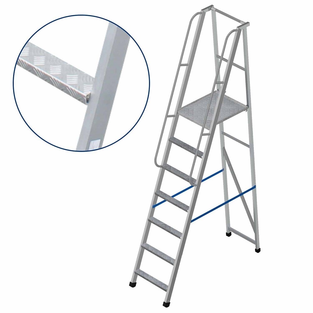 Алюминиевая лестница-платформа Мегал фиксированной высоты с широкими ступенями ЛПФВА Н=1,5-6 – это профессиональная алюминий лестница, предназначенная для безопасной и удобной работы на складах, стройплощадках, в производственных цехах и в частных домах. Прочная конструкция, удобство использования и долговечность делают её незаменимой.