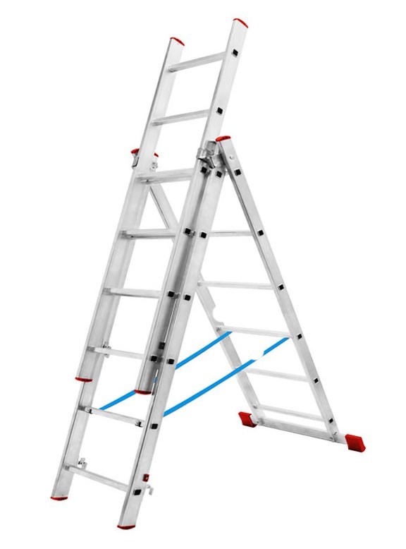 - Трехсекционная конструкция позволяет использовать лестницу в разных положениях, что повышает ее универсальность.