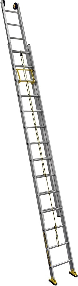 Алюминиевая выдвижная лестница Centaure C2 NEW с тросом 2х21 414421 - комфортабельная лестница для работы на больших высотах. Специально сделанные ступеньки с наклоном обеспечивают удобное положение ступени при использовании. Уникальная надежная система стального замка-коромысла с двойным рычагом. Автоматическая блокировка под действием силы тяжести. Испытана на нагрузку в 400 кг. Шарнирные башмаки, подошва снабжены индикатором износа. Простое использование благодаря кольцевому сердечнику. Встроенная система ползунков по всей длине профиля гарантирует оптимальную установку в рабочее положение и прочность лестницы при максимальном выдвижении секций. Направляющие из алюминия, рассчитанные на интенсивное ежедневное использование. Алюминиевые нескользящие ступени 28 х 25.5 мм. Расстояние между ступенями 280 мм. Надёжное крепление ступеней к направляющим путём тройного зажима и фальцевания. Ролик из алюминиевого сплава, диаметром 125 мм; не оставляют следов на опорных поверхностях.