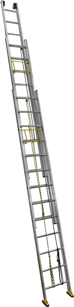 Алюминиевая выдвижная лестница Centaure C3 NEW с тросом 3х24 414624 - комфортабельная лестница для работы на больших высотах. Специально сделанные ступеньки с наклоном обеспечивают удобное положение ступени при использовании. Уникальная надежная система стального замка-коромысла с двойным рычагом. Автоматическая блокировка под действием силы тяжести. Испытана на нагрузку в 400 кг. Шарнирные башмаки, подошва снабжены индикатором износа. Простое использование благодаря кольцевому сердечнику. Встроенная система ползунков по всей длине профиля гарантирует оптимальную установку в рабочее положение и прочность лестницы при максимальном выдвижении секций. Направляющие из алюминия, рассчитанные на интенсивное ежедневное использование. Алюминиевые нескользящие ступени 28 х 25.5 мм. Расстояние между ступенями 280 мм. Надёжное крепление ступеней к направляющим путём тройного зажима и фальцевания. Ролик из алюминиевого сплава, диаметром 125 мм; не оставляют следов на опорных поверхностях.
