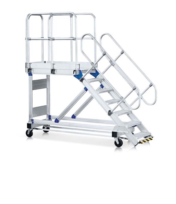Алюминиевый трап с платформой Zarges Z600 передвижной 800мм 13 ступеней 45° 40259659 с эргономичным стопором Ergo Stop. Мобильность и комфорт: лестница с эргономичной функцией тормоза, а также платформа особо большого размера. Лестница-платформа, исключительно быстро приводимая в рабочую готовность благодаря новой системе тормозов ZARGES - теперь в числе стандартных изделий. ZARGES Ergo Stop - все четыре ролика тормозятся очень удобно с помощью педали у нижней ступеньки. Особо просторная платформа размерами 1 200 x 800 мм позволяет удобно работать даже двум человекам. Стойки из высокопрочных алюминиевых прессованных профилей с резьбовыми каналами для гибкого монтажа. Выбор необходимого наклона: 45° для удобного подъема или 60° для узких мест. Серийное покрытие ступеней - желобчатый алюминий. В качестве опции за дополнительную плату доступно также покрытие из стальной решетки. Это следует указать при заказе. Перильное ограждение: серийное оснащение с двусторонним поручнем и перилами площадки по периметру. Примечание: Соответствует DIN EN ISO 14 122.