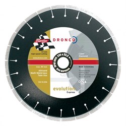 Алмазный диск Dronco Evolution Express 230 мм для широкого спектра применения - от твердой каменной породы до песчаника. Подходит также для резания стального профиля толщиной стенки до 3,5 мм. Отлично подходит для следующих материалов: бетон, армированный бетон, ковкие и чугунные трубы, гранит, клинкер, бетон с обнаженным заполнителем. Очень хорошо подходит для следующих материалов: базальт, стальная сетка, бетонная черепица, композитное бетонное дорожное покрытие, для проезжей части, терракотовые плиты, каменная керамика, огнеупоры, гнейс, дорожный клинкер, порфир, стали (толщина до 3,5 мм), мозаичный пол, кирпич. Подходит для следующих материалов: мощеный пол, штукатура, асбестовый шифер (этернит), керамическая плитка, кафель, газобетон, чугун (толщина до 5 мм), силикатный кирпич, известняк, шифер. Высота сегментов 5 + 2 мм. Сухой рез (резание без СОЖ). Форма несущего диска: C 3 (с плотным расположением зубьев). Минимальное количество для заказа 1 шт. Изготовлено в соответствии с EN 13236. Соответствует положениям oSa. Сделано в Германии.