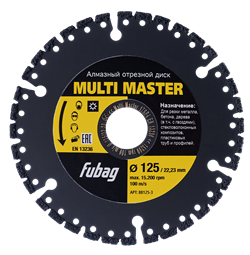Алмазный диск Fubag Multi Master 125x22,2мм с сегментной режущей кромкой, предназначен для резки металла, бетона, дерева (в том числе с гвоздями), стекловолоконных композитов, пластиковых труб и профилей.