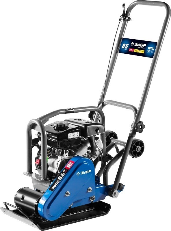 Бензиновая виброплита Зубр Профессионал 8,5 кН ЗВПБ-8.5 Г предназначена для уплотнения смешанного грунта, песка, а также тротуарной плитки (при установке резиновой накладки на подошву).