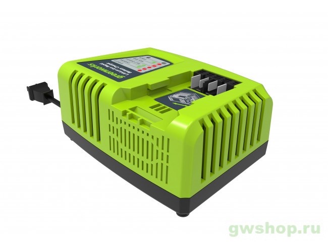 Быстрое зарядное устройство Greenworks G40UC4 - это компактное оборудование, используемое для быстрой подзарядки аккумуляторов электроинструментов. Представленная модель, облаченная в прочный пластиковый корпус черно-зеленого цвета, предназначена для пополнения заряда литий-ионных АКБ. Длительный срок службы зарядного устройства обеспечен интегрированной системой защиты от перезаряда: при достижении аккумулятором 100-процентной емкости зарядка автоматически прекращается. Устойчивости оборудования на любой горизонтальной поверхности способствуют прорезиненные ножки.