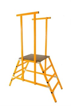 Диэлектрическая подмость ЗЭП 2x5 ССП-1,5-42 (поручень) - это двусторонняя подмость с большой рабочей площадкой и перилами - ограждениями. Для изготовления тетивы используется диэлектрический стекловолоконный профиль прямоугольного сечения. На верхних концах тетив установлены пластиковые (ПВД/ПНД) заглушки, на нижних – противоскользящие эластополимерные опоры. Нижняя ступень имеет дополнительное усиление в виде металлических распорок, что повышает прочность конструкции. Ступени изготовлены из профиля 36х26 мм с противоскользящими ребрами.