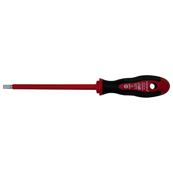 Диэлектрическая шлицевая отвертка Haupa 2K-VDE SL 4x100 для электромонтера 101916 оснащена двухкомпонентной рукояткой из полипропилена/термоэластопласта. Закаленный и прошедший пескоструйную обработку стержень изготовлен из молибден-ванадиевой стали. Каждая отвертка проверяется индивидуально. На рукоятке отвертки методом литья нанесена маркировка профиля наконечника, которая обеспечивает удобство при выборе нужного инструмента в ящике, маркировка не стирается. Равномерная подгонка рукоятки отвертки под руку обеспечивает еще лучшую передачу усилия. Зона рукоятки с мягкой пластмассой была увеличена. Двухкомпонентная рукоятка отвертки из полипропилена/термоэластопласта отличается элегантным дизайном, эргономичной формой и защитой от соскальзывания. Защита от скатывания. Маркировка 1000 В. Намагниченный наконечник. Дополнительная защита от соскальзывания предотвращает выскальзывание из винта. Серебряный наконечник защищает от коррозии.