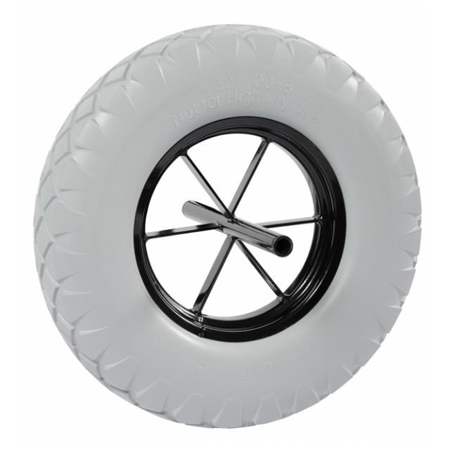 Колесо литое для тачки Haemmerlin PF 110 400мм - полипропиленовое колесо на оси, непробиваемое, с протектором, на металлическом диске со спицами, которые фиксируются с помощью подшипников.