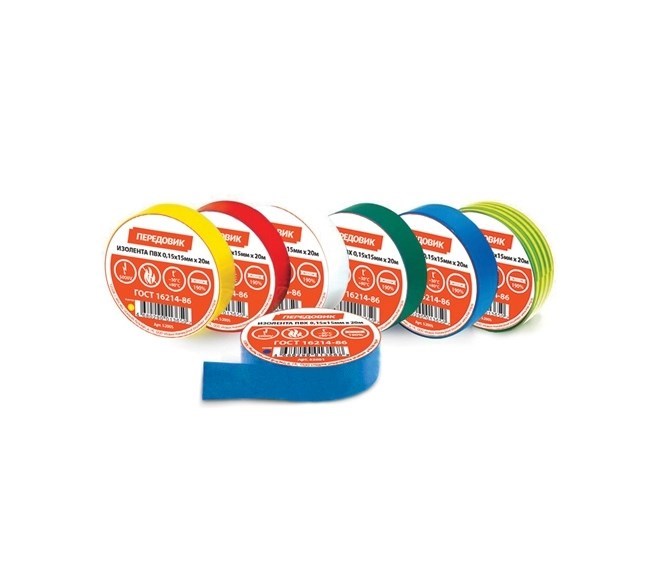 Красная изолента Передовик ПВХ 19мм х 20м 52011 изготовлена из поливинилхлорида и имеет клейкую основу.