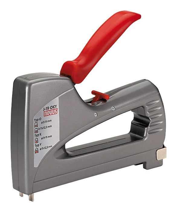 Механический кабельный степлер Novus J-19OKY применяется для крепления кабеля к поверхности из дерева или гипсокартона. Работать можно под напряжением до 500 В. Подходящие для степлера скобы типа O, K, Y имеют изолированную поверхность. В комплекте с инструментом идут скобы типа О и К, а также практичный и компактный чемодан.