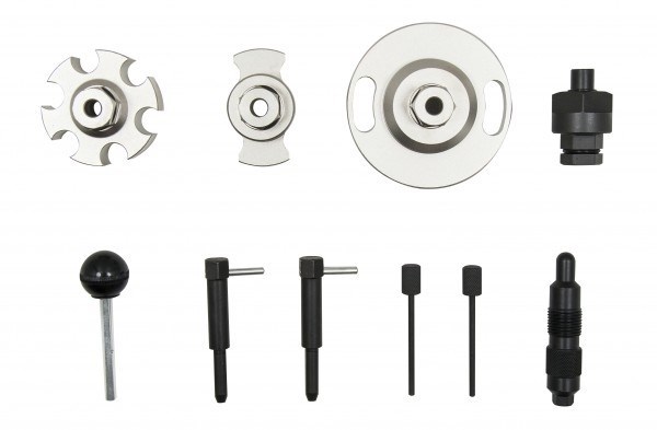 Этот набор приспособлений разработан специально для регулировки фаз ГРМ двигателей VAG 2.7/3.0 Tdi, 4.0 Tdi. Он позволяет производить необходимые настройки с высокой точностью и без повреждения деталей двигателя.
