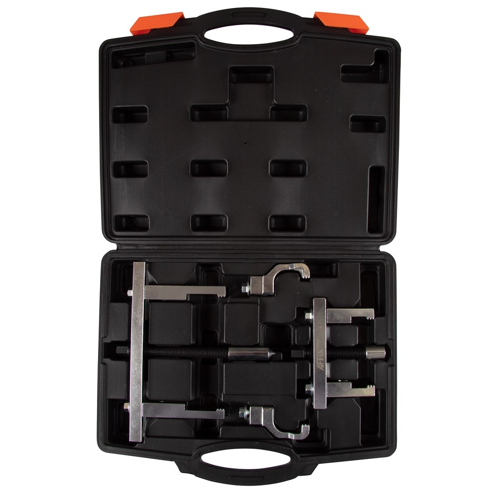 Назначение Демонтаж шкивов для клиновых ременных приводов генератора, коленчатого вала, системы охлаждения и кондиционера. Комплектация – Траверса для шкивов Ø 100-210 мм с силовым винтом М16×2.0 – Траверса для шкивов Ø 45-120 мм с силовым винтом М16×2.0 – Захватные лапы прямые 60 мм (2 шт.) – Захватные лапы прямые 110 мм (2 шт.) – Захватные лапы изогнутые 60 мм (2 шт.) Технические характеристики Материалы – сталь, хром, пластик (кейс) Размеры кейса – 385 × 305 × 80 мм Вес – 4,153 кг