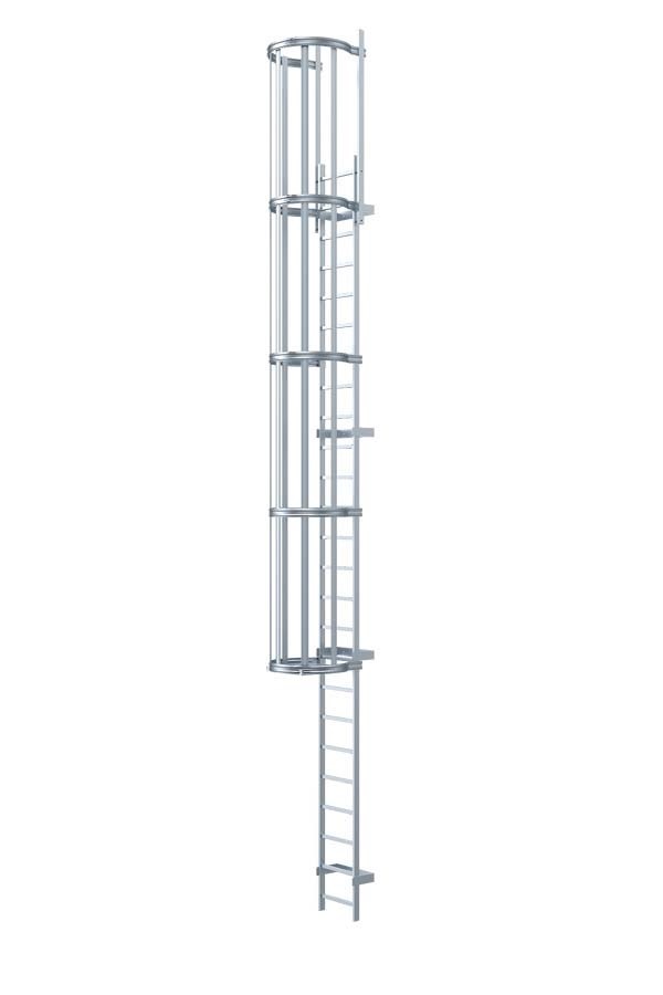 Наружная пожарная лестница Zarges Z600 анодированная, 7,4м 58174 стационарный доступ к зданиям и машинам на высоте до 10 м. Может использоваться, и сертифицировано, как путь эвакуации. Для стационарного монтажа по месту в зданиях, либо для техобслуживания согласно стандарту DIN 18 799-1, либо в качестве системы эвакуационных лестниц согласно стандарту DIN 14 094-1, либо для доступа к машинам согласно стандарту DIN EN ISO 14 122-4. Решетка для защиты спины как средство безопасности, используется согласно любому стандарту. Рейка для защиты при подъеме согл. DIN EN 353-1, по стандартам DIN 18 799-1 и DIN EN ISO 14 122-4, также при высоте подъема свыше 10 м как одноходовая лестница для подъема. Ширина лестницы: 520 мм. Стенное крепление с различными расстояниями от стены, до 600 мм по выбору. Расстояние между настенными креплениями составляет не более 2,00 м. При этом для монтажа каждой лестничной секции используют не менее двух креплений. Шкафы для предохранителей, блокировка проходов, а также площадки можно выбирать по требованию. Нестандартные лестницы изготавливаются на заказ. Примечание: Дюбели и винты для крепления к стене в комплект поставки не входят. Приведенные ниже двухступенчатые цены на оборудование рассчитаны следующим образом: настенное крепление U-образной формы, 200 мм жесткие, с обеих сторон прямые тетивы на выходных участках, включая решетчатую защиту спины согласно\ DIN 18 799-1. Если ваши требования отличаются, просим воспользоваться нашей системой планирования стремянок.