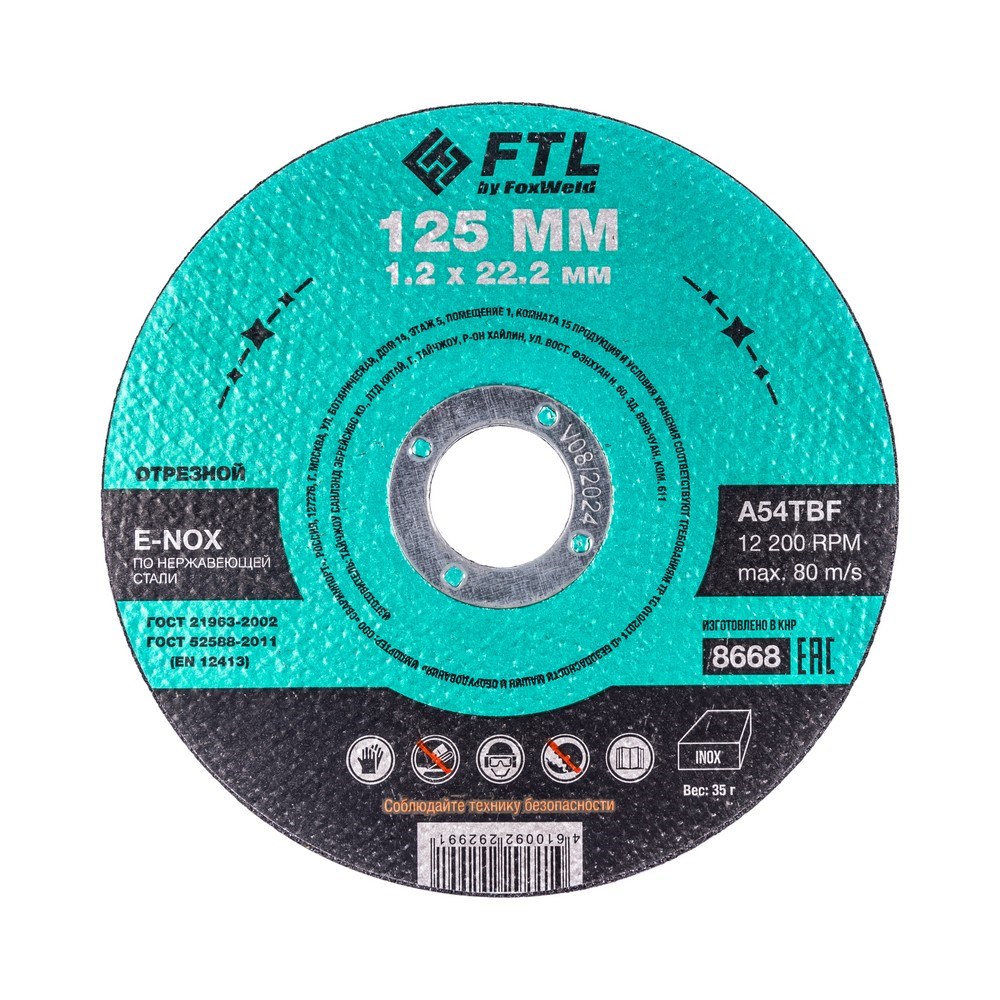 Отрезной круг по нержавеющей стали FoxWeld FTL E-Nox 125 х 1,2 х 22,2 мм A54TBF - расходный инструмент для ручной угловой шлифовальной машины, предназначенный для резки различных изделий из нержавеющих и легированных сталей.