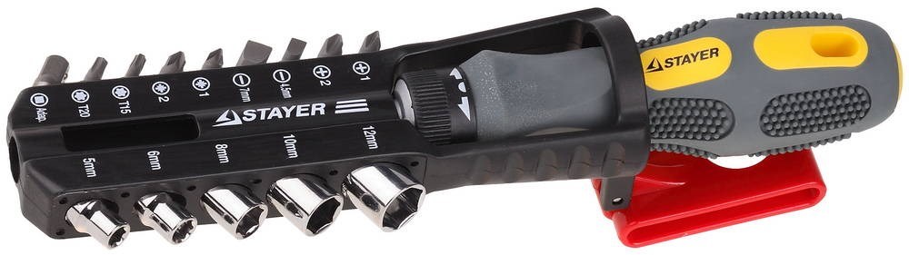 Отвертка с набором бит Stayer "Max Grip" 1/4" 15шт 25923-H15 G предназначена для монтажа и демонтажа резьбовых соединений. Насадки из высококачественной хромованадиевой стали. Эргономичные двухкомпонентные противоскользящие ударопрочные рукоятки с упором для большого пальца и отверстием для подвески. Набор из 15 предметов: реверсивная рукоятка с магнитным держателем для бит; адаптер Hex1/4” – SQ1/4” для торцевых головок; биты (SL 4,0 мм; SL 7,0 мм; PH №1; PH № 2; PZ №1; PZ №2; TORX T15; T20); торцевые головки (5 мм; 6 мм; 8 мм; 10 мм; 12 мм).