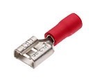 Плоский изолированный разъем КВТ РПИ-М 1.5-(2.8) (мама) изготовлен по ТУ 3424-001-59861269-2004. Предназначен для монтажа быстроразъемных соединений многопроволочных гибких медных проводов методом опрессовки. Материал изоляции: самозатухающий ПВХ. Класс V-0 по UL94. Термостойкость изоляции: 75 °C. Материал разъема: латунь марки Л63. Покрытие разъема: электролитическое лужение. Максимальное напряжение: 400 В. Особенности конструкции: поперечные засечки на внутренней поверхности трубной части разъемов увеличивают механическую прочность соединения с жилой; каждая клемма имеет отверстие для фиксатора замкового типа для прочного механического соединения с разъемом «папа»; Размер контакта определяется шириной «В» клеммы РПИ-П. Комплементарны разъемам РПИ-П и выходам типа «папа» на клеммах электрических устройств. Опрессовка проводника поверх изолирующей манжеты.