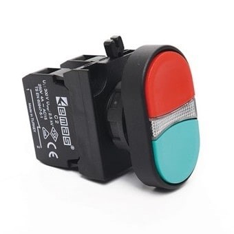 Сдвоенная нажимная кнопка EMAS красно-зеленая с подсветкой белым светодиодом 100-230V AC (1НО+1НЗ) CP1B2K20KY