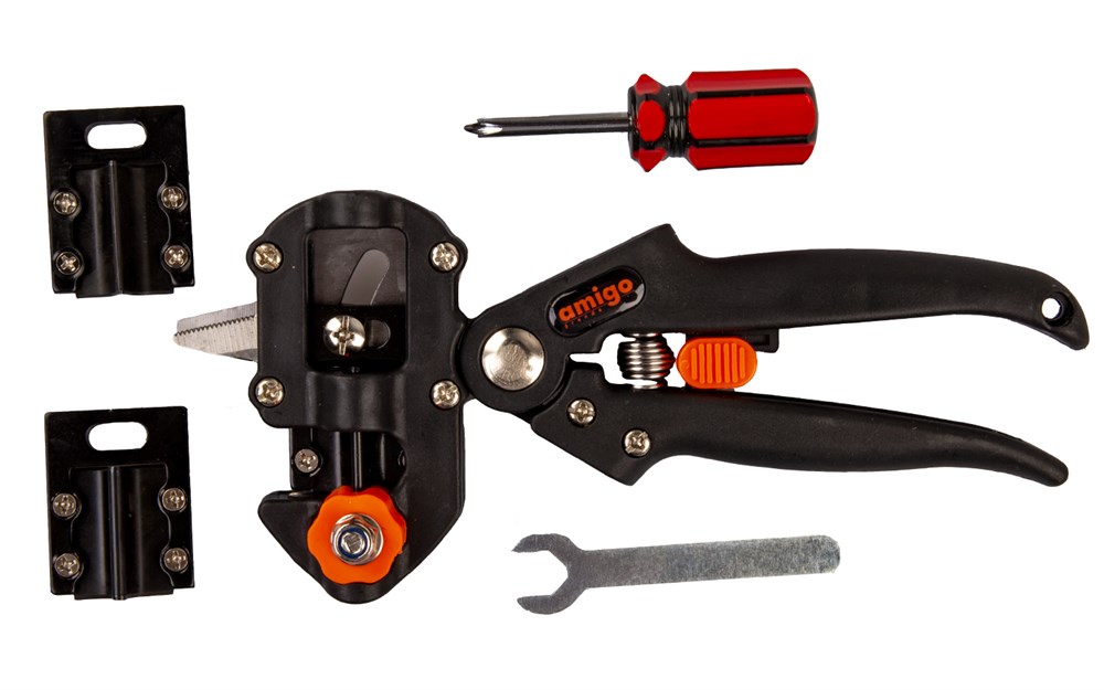 - Комплектация: секатор с тремя лезвиями, отвертка, ключ.
