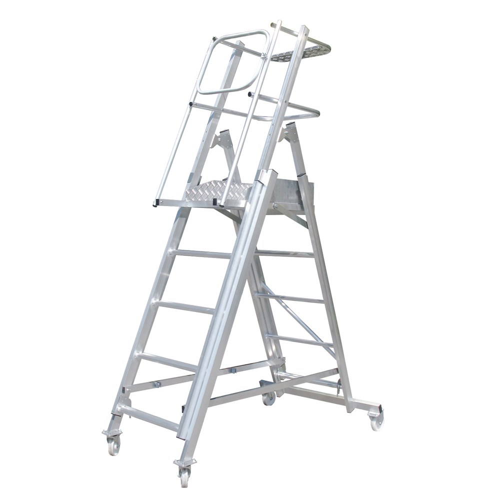 Телескопическая лестница–платформа с калиткой MEGAL - ТЛП-К (2,1 - 3,7) предназначена для работ в торговых залах, на складах, вдоль стеллажей и других объектов, при проведении ремонтных, монтажных и иных работ.