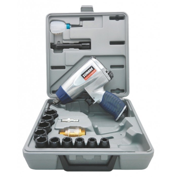 Ударный пневмогайковерт Sumake ST-M1001K с набором головок имеет очень высокий крутящий момент, благодаря чему можно работать с крайне твердыми резьбовыми соединениями. Алюминиевый корпус повышает рабочий ресурс инструмента. Рукоятка полностью покрыта морозо- и удароустойчивой резиной - для комфортной работы пользователя.