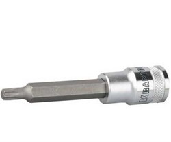 Удлиненная торцевая бита-головка Kraftool Industrie Qualitat 1/2" T27x100 мм 27906-27_z01 предназначена для монтажа/демонтажа резьбовых соединений. Имеет увеличенную длину и применяется для работы со сложными деталями удлиненной или углубленной формы, а также для обслуживания крепежа в труднодоступных местах. Изготовлена из высококачественной стали S2, что делает изделие прочным, долговечным и износостойким. Сатинированное покрытие защищает деталь от коррозии. Головка имеет вставку с профилем «TORX» и обеспечивает эффективное завинчивание. Обладает большим рабочим ресурсом и выдерживает высокие динамические нагрузки, поэтому ее широко используют на производстве и в автосервисах.